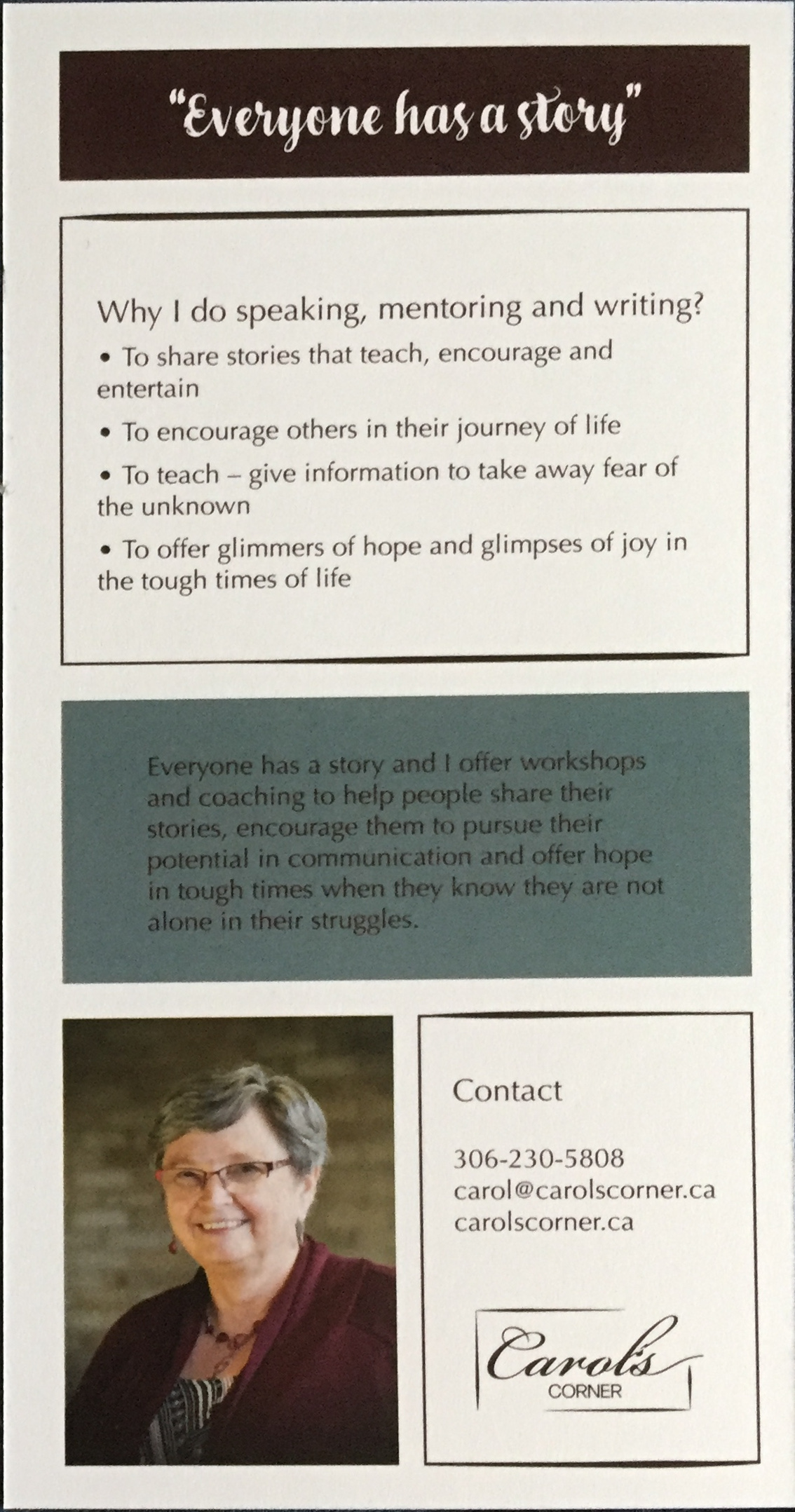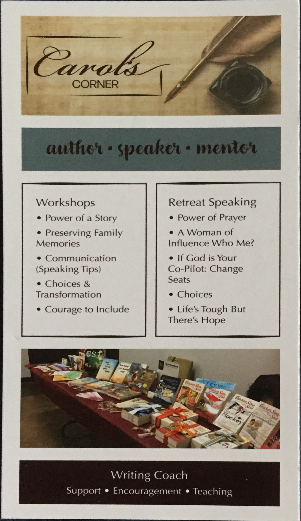 Carol is an inspirational speaker, published author, storyteller, and coach who loves to share from her heart, with others, on an individual basis or to groups large and small.